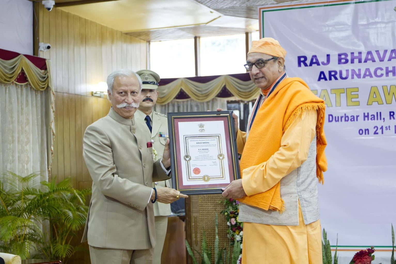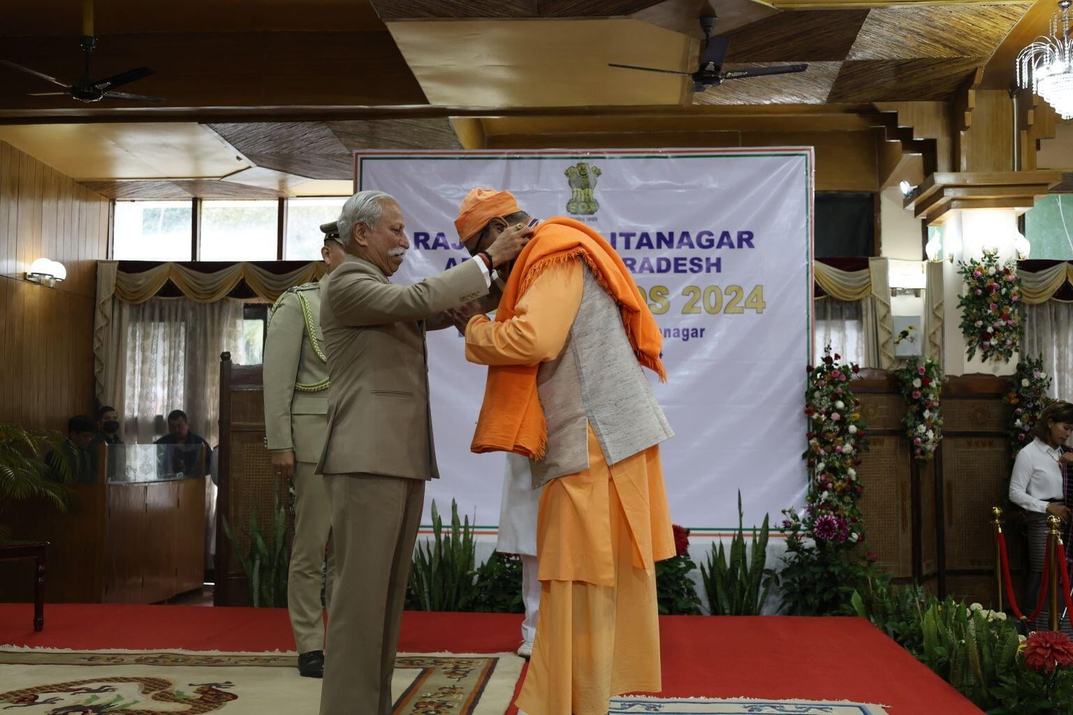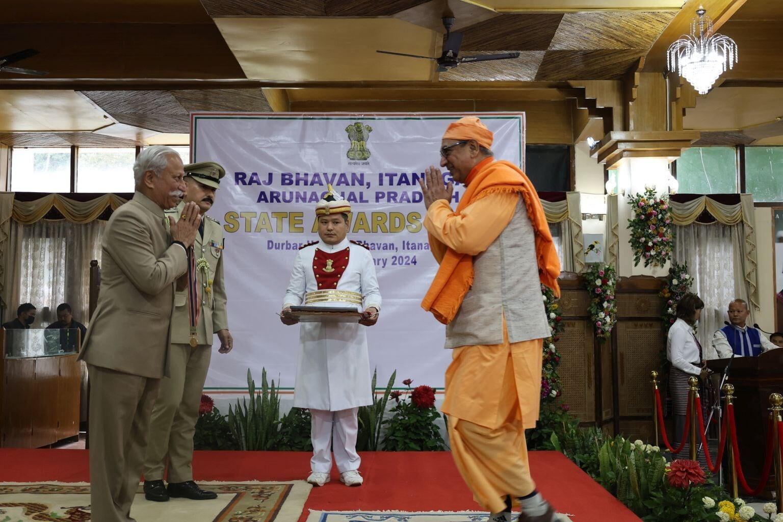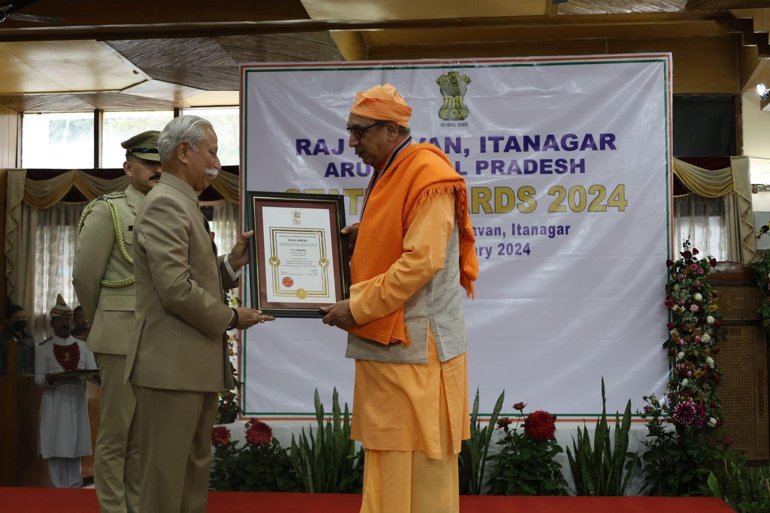 The Ramakrishna Mission received a gold medal from Lt Gen Kaiwalya Trivikram Parnaik, PVSM, UYSM, YSM (Retd), the Hon'ble Governor of Arunachal Pradesh, in appreciation of its meritorious services rendered to the state. Swami Sarvaganandaji, a senior monk of the Ramakrishna Mission in Arunachal Pradesh, accepted the award on behalf of the organisation at a ceremony conducted on February 20, 2024, the statehood day of Arunachal Pradesh, at Gen. Bipin Rawat Hall, Raj Bhawan, Itanagar.