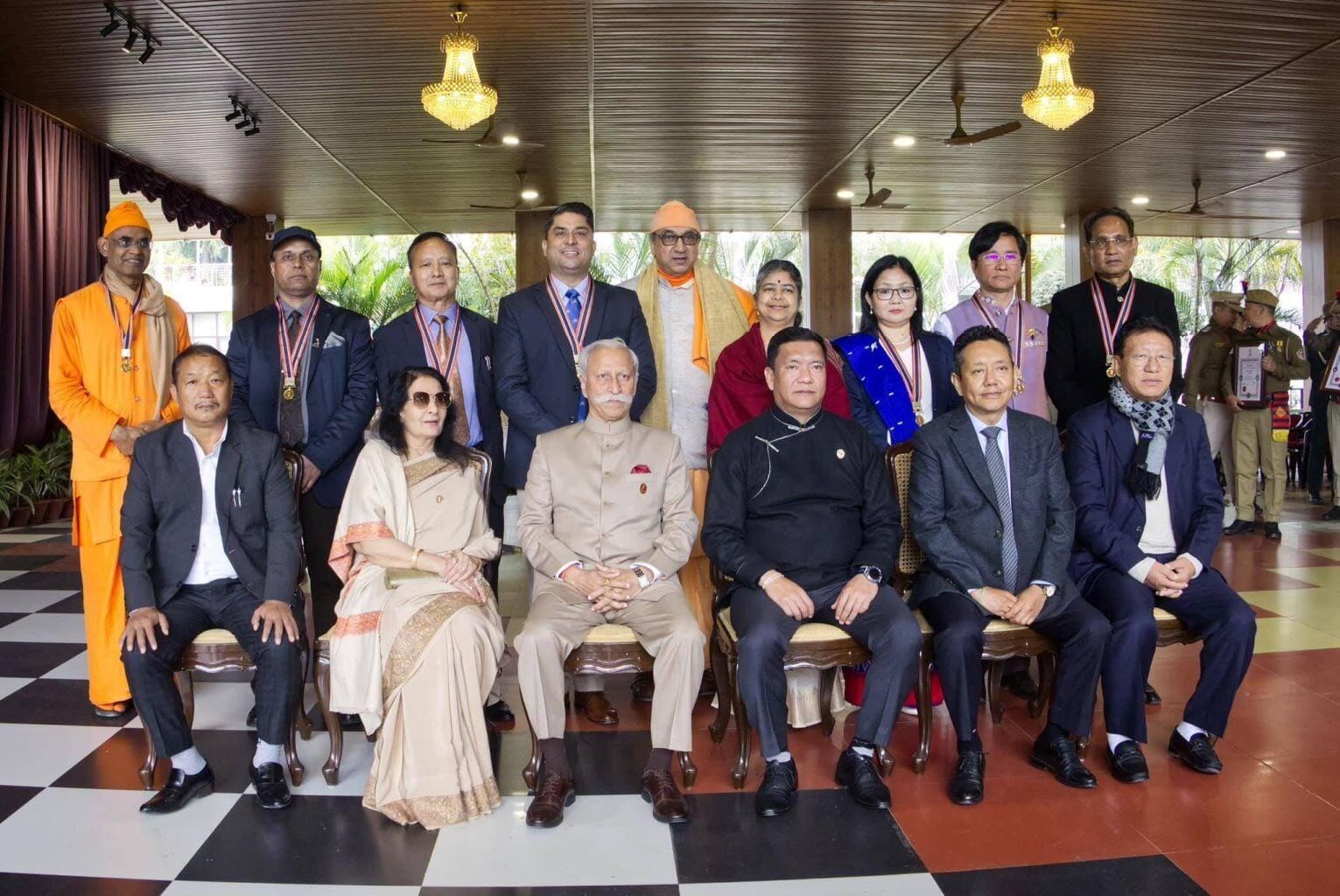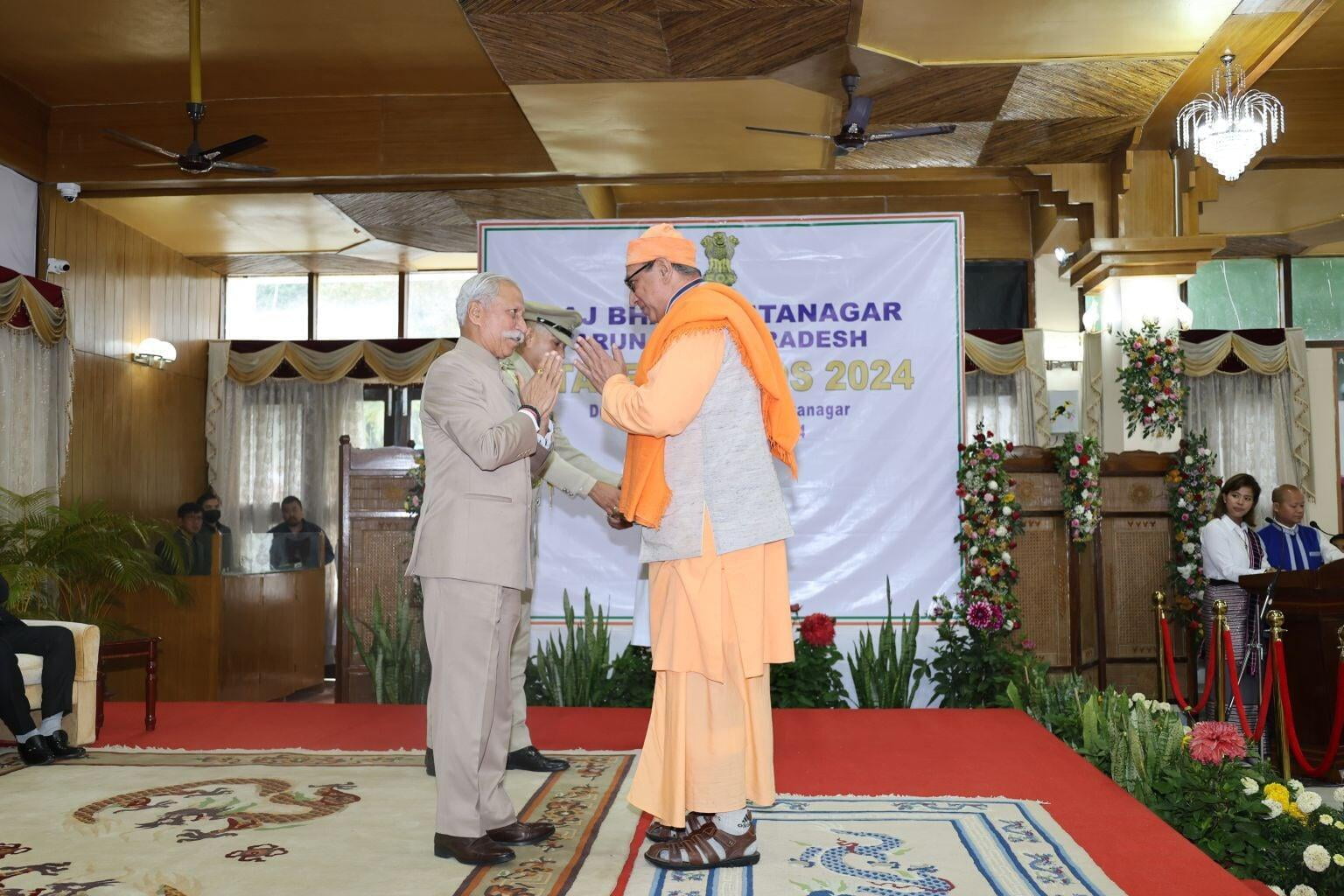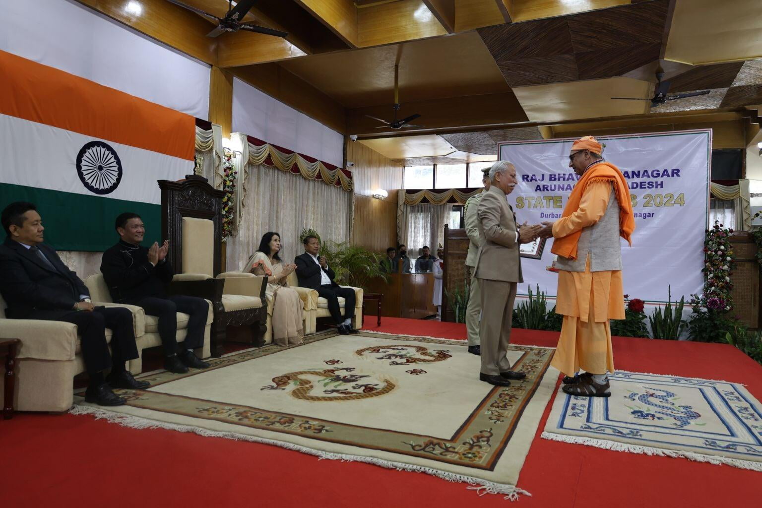 The Ramakrishna Mission received a gold medal from Lt Gen Kaiwalya Trivikram Parnaik, PVSM, UYSM, YSM (Retd), the Hon'ble Governor of Arunachal Pradesh, in appreciation of its meritorious services rendered to the state. Swami Sarvaganandaji, a senior monk of the Ramakrishna Mission in Arunachal Pradesh, accepted the award on behalf of the organisation at a ceremony conducted on February 20, 2024, the statehood day of Arunachal Pradesh, at Gen. Bipin Rawat Hall, Raj Bhawan, Itanagar.