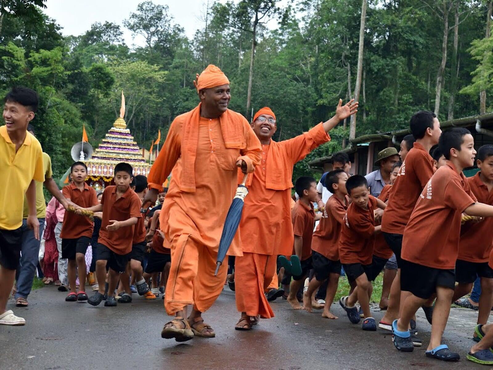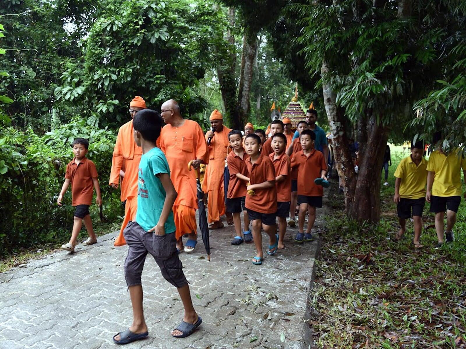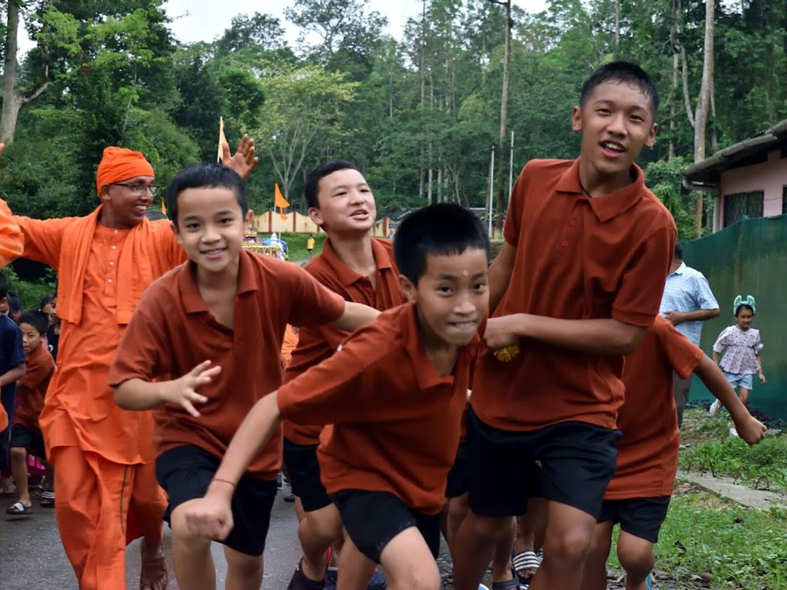 The onward Journey of the Chariot commenced from the primary hostel after puja, a food offering, and arati. Students from all hostels, staff and their family members, and sannyasins took part in the celebrations.